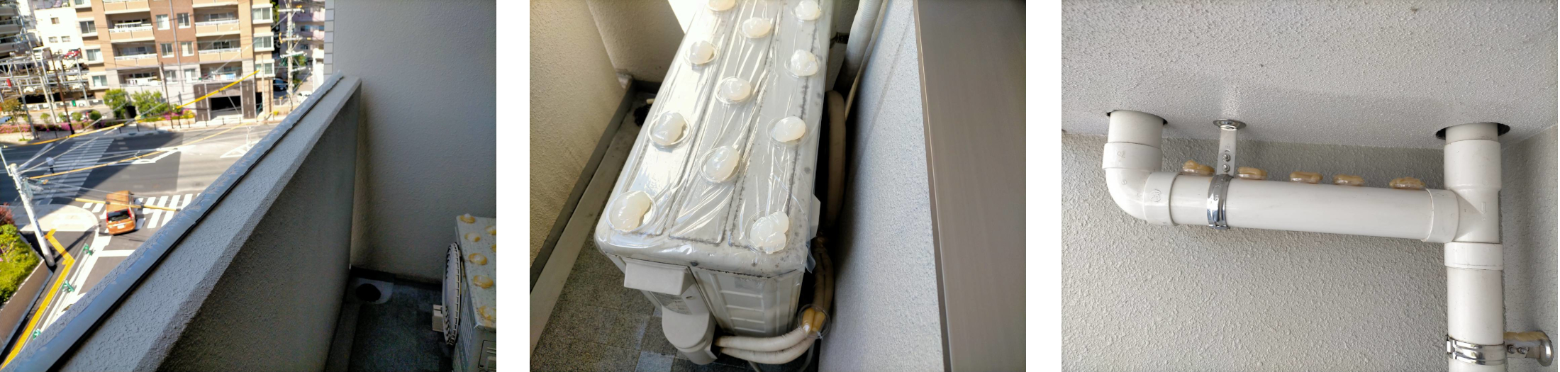 エアコン室外機の下、天井に近い排水管の上、雨戸袋の上、シャッターボックス上、屋根とベランダとの隙、出窓の屋根、排気(換気)ダクト等に忌避剤を施行することによりハトが寄り付かなくなります。